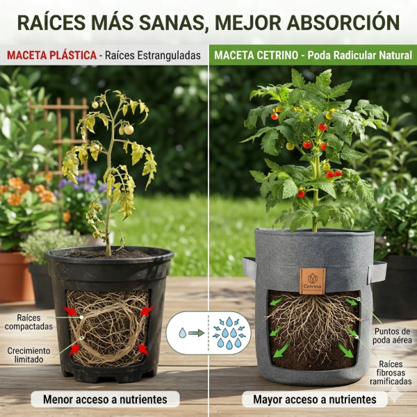 Mejor transpiración debido a su porosidad, lo que se traduce en un mejor desarrollo del sistema radicular. En macetas rígidas, las raíces principales no paran de crecer, arrollándose sobre sí mismas y disminuyendo su capacidad de absorción de nutrientes. En macetas geotextiles CETRINO, las raíces principales desarrollan cientos de raíces secundarias que tienen gran capacidad de absorción de nutrientes, tal como ocurre cuando las plantas se desarrollan sobre el terreno directamente. Esto se traduce en mejor crecimiento y desarrollo de las plantas.